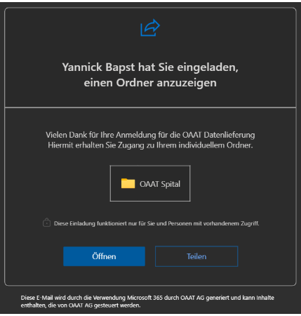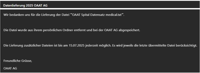 Bitte beachten Sie, dass alle Dateien durch die OAAT AG zeitnah aus Ihrem Briefkasten entfernt werden. Sie erhalten anschliessend eine E-Mail, welche Ihnen jede Datenübermittlung einzeln bestätigt: