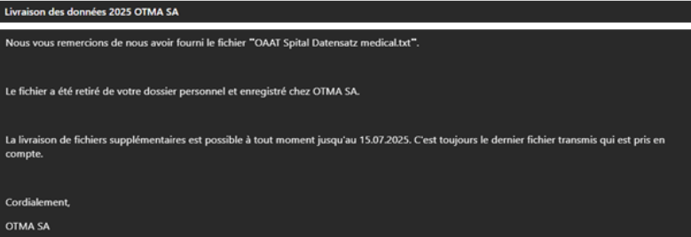 Veuillez noter que tous les fichiers seront rapidement retirés de votre boîte aux lettres par l'OTMASA. Vous recevrez ensuite un e-mail qui vous confirmera individuellement chaque transmission de données :