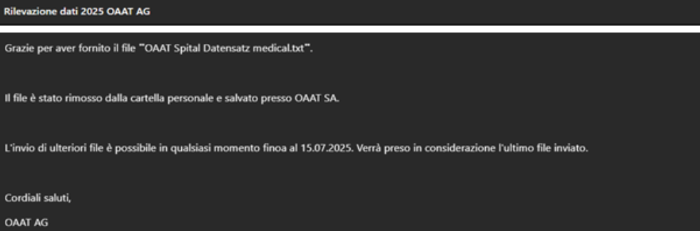 Si prega di notare che tutti i file vengono prontamente rimossi dalla vostra casella di posta elettronica da OTMA SA. Riceverete quindi un'e-mail di conferma di ogni singolo trasferimento di dati: